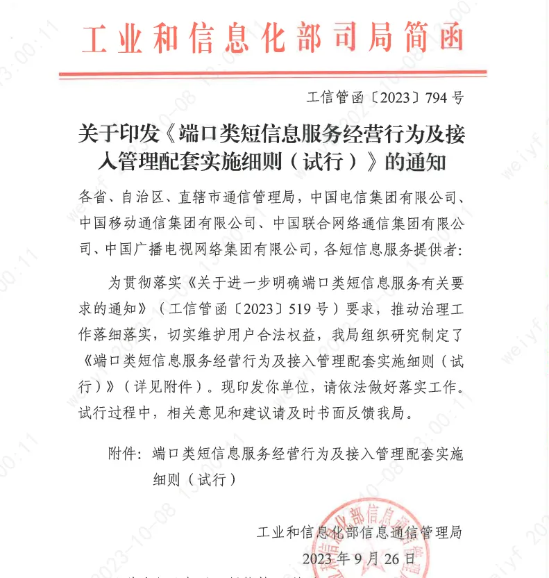 根据工信管函【2023】794号等相关文件及基础电信运营商关于规范端口类短信业务经营行为和安全管理规范的规定,短信息内容提供者需要报备相关实名资质信息。为了落实工信部短信实名管理要求,中国电信、中国联通、中国移动三大运营商通知要求短信消息发送需要规范签名及发送前做签名实名报备制。从2024年8月起执行,具体要求如下。